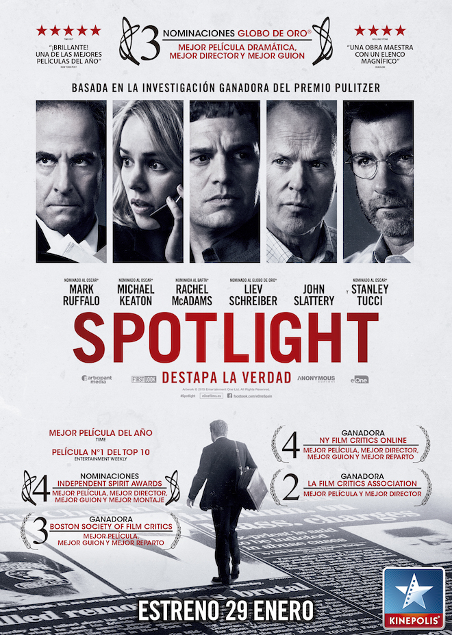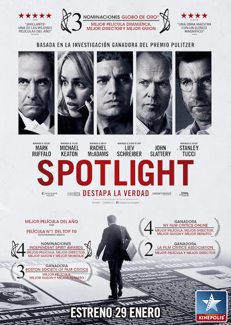 Spotlight era el nombre con el que conocía a un grupo de reporteros del periódico Boston Globe que, en el año 2003, levantaron la liebre y destaparon el escándalo de los sistemáticos abusos sexuales contra menores cometidos por sacerdotes de la Iglesia Católica a lo largo de décadas, y las artimañas de los altos cargos de la organización, hasta el mismísimo Vaticano por encubrir dichos abusos. Y no solo de los estamento religiosos, sino también políticos, docentes, etc. Dicho trabajo de investigación fue ganador del premio Pulitzer. Lo mejor de este film, desde mi punto de vista, es que a pesar de su escabroso tema de fondo, la película se centra mucho más en la labor de investigación de los periodistas y de cómo esto les afecta en su vida personal, en vez de caer en lo que hubiera sido el recurso fácil de aprovechar el morbo del tema que trata. Resulta muy interesante ver las argucias y los juegos de poder de los distintos estamentos de la Iglesia, y otros poderes políticos, para ocultar la verdad de tan atroces hechos y no deja de resultar inquietante darse cuenta de que son hechos muy recientes y que, seguramente, sigan pasando a día de hoy. Amén de la cantidad de gente implicada en el caso. Con un reparto de lujo compuesto por Michael Keaton, Mark Ruffalo, Rachel McAdams y Liev Schreiber como cabezas visibles y el eterno secundario que siempre cumple, Stanley Tucci, en el que todos están a un nivel interpretativo altísimo, Spotlight es un gran ejercicio cinematográfico que información y crítica social, que mantiene el interés del espectador en todo momento, resultando muy entretenida. Con 6 nominaciones a los Oscar, incluyendo el de Mejor Película, Spotlight puede ser la gran tapada de este año y dar la campanada. Improbable, si, pero no imposible. Un film muy recomendado que no dejará indiferente a nadie y que disfrutará la gran mayoría de los espectadores. Lo mejor: El reparto. Lo bien tratado que está el tema, sin caer en dramas exagerados, lágrima fácil o morbo innecesario. Lo peor: Que esté basada en hechos reales. Que no sea más incisiva y que la crítica no sea más feroz. Nota: 7,5/10 La frase: "Si la comunidad puede criar a un niño, la comunidad puede abusar de él" "Si eres un niño pobre, de una familia pobre y un cura te presta atención, te sientes muy especial. ¿Cómo le dices que no a Dios"